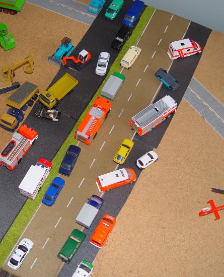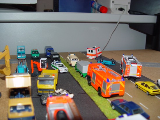 Baustellenfahrzeuge geschleudert. Das Fahrzeug fing Feuer. Durch dieses
